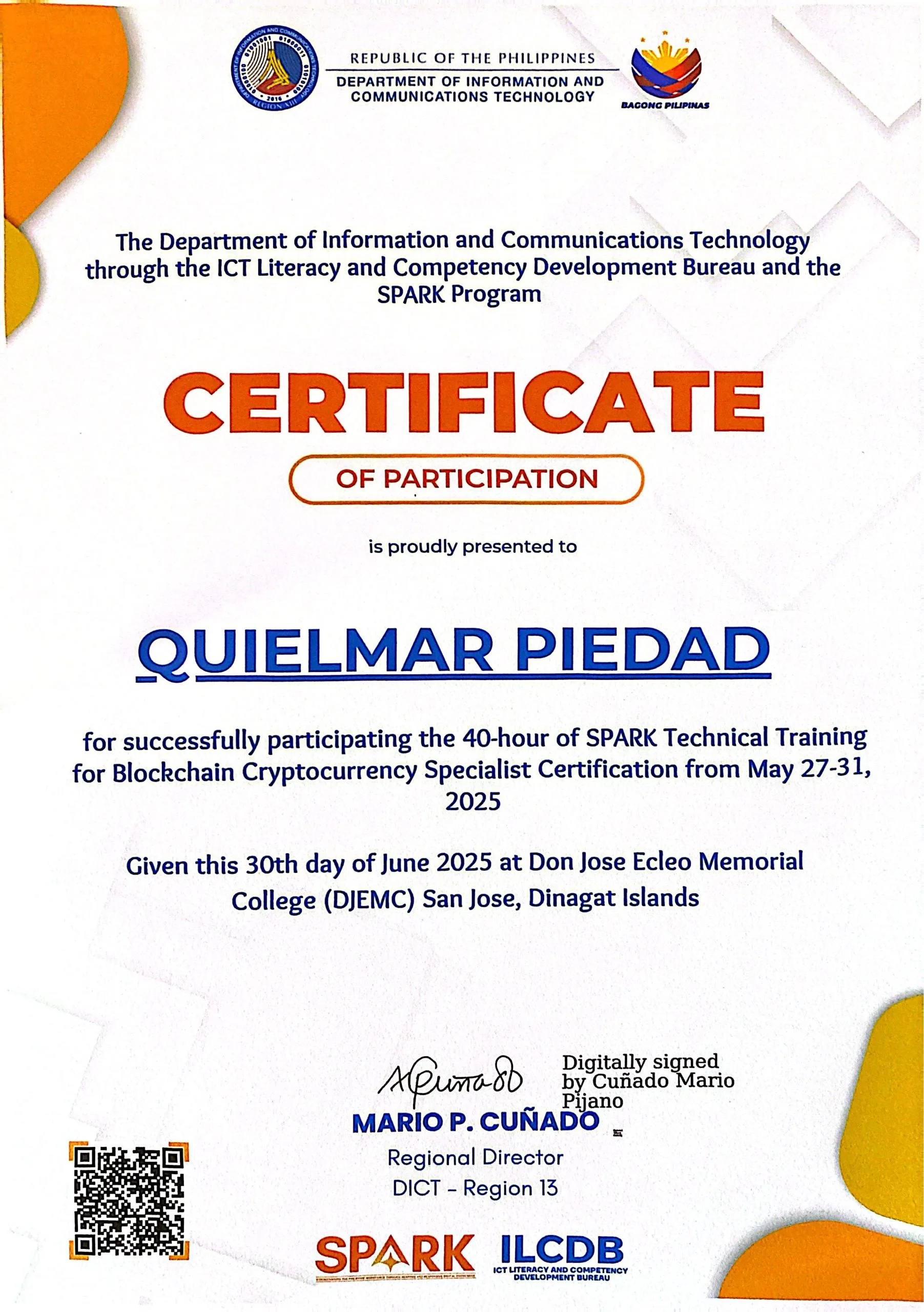 Completed Blockchain Cryptocurrency Specialist training under DICT's ICT Literacy and Competency Development Bureau via the SPARK Program.
