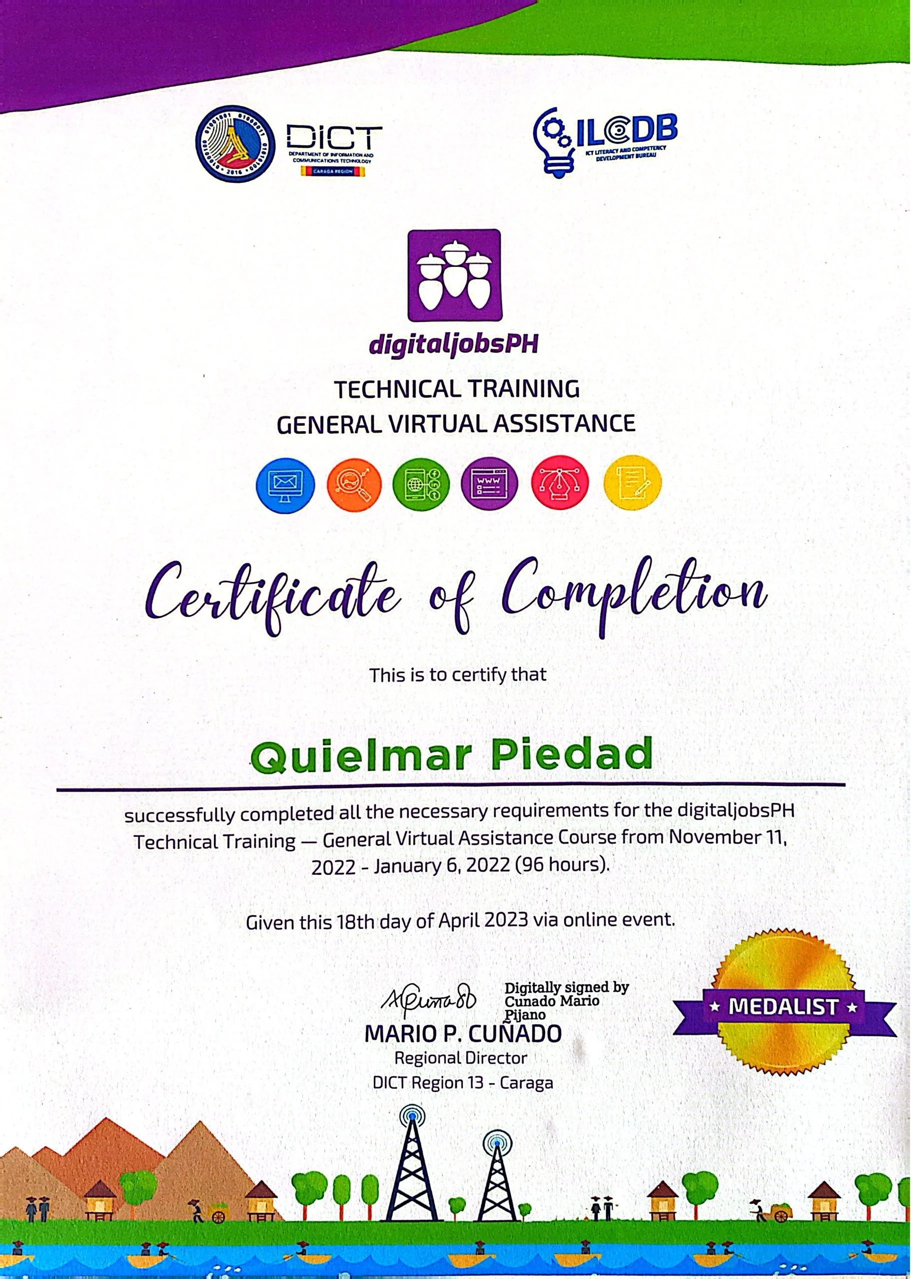 Completed professional training in General Virtual Assistant at the Department of Information and Communications Technology (DICT).